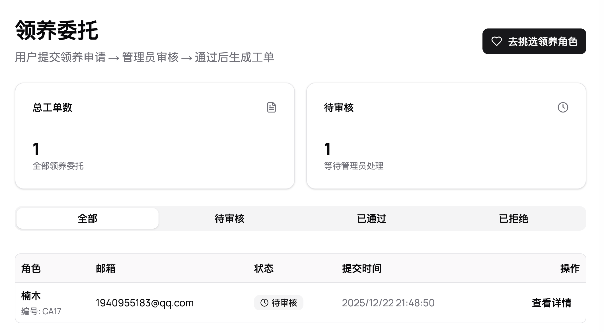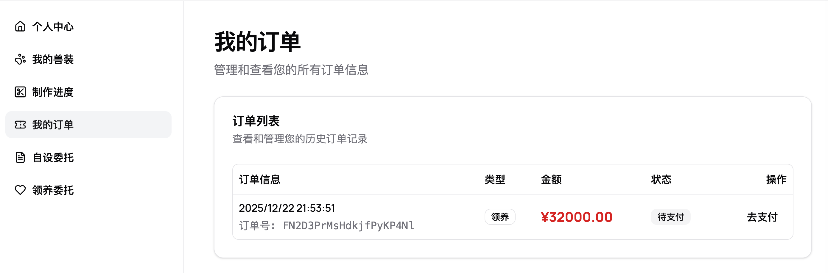 第九步:如果状态显示「已通过」,则可进入「我的订单」查看新生成的工单,客服会通过你留下的联系方式联系你支付订金以及签订合同,以上全部完成后确认领养成功!等待制作即可